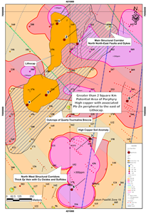 Figure 1: Compilation map showing the location of the extensive leached cap (lithocap) and associated structures, quartz-copper veins, soil geochemical anomalies, tourmaline breccias associated with a magnetic low, that comprise the key criteria for a mineralized porphyry target.