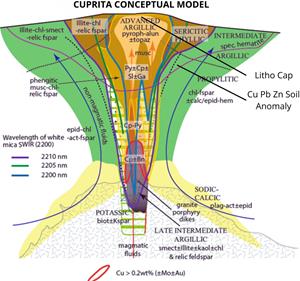 Conceptual model for the Cuprita porphyry target (modified after Halley et al., 2015 ). The key geological components for the classic mineralized Andean porphyry model have been identified at the Cuprita target.